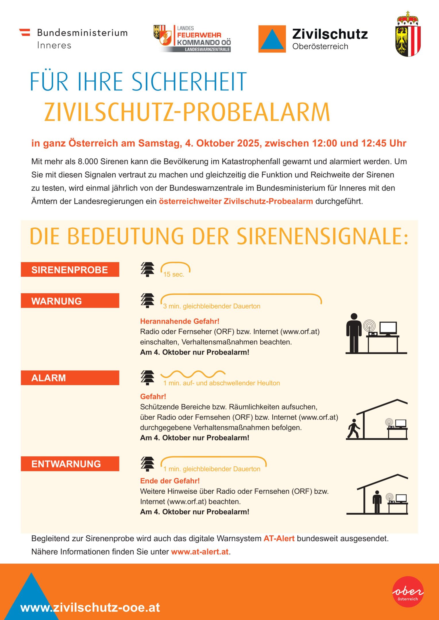 Nähere Informationen zu den einzelnen Sirenensignalen mit der Möglichkeit diese anzuhören bzw. zum bundesweiten Warn-und Alarmsystem unter: Zivilschutztag 2025 – Zivilschutz OÖ