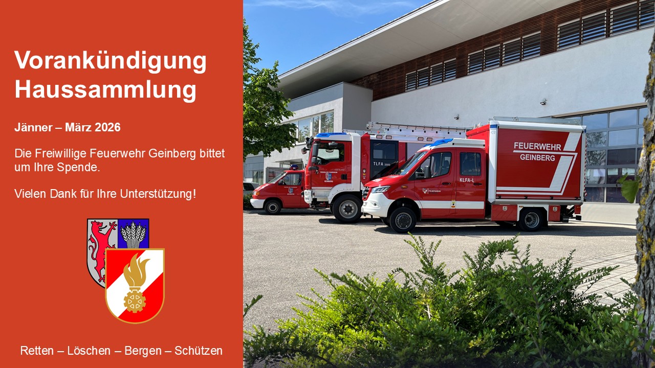 Im Zeitraum von Jänner bis März führt die Freiwillige Feuerwehr Geinberg eine Haussammlung durch. Unsere Mitglieder werden persönlich alle Haushalte im Löschbereich Geinberg besuchen und um Ihre Unterstützung bitten.
