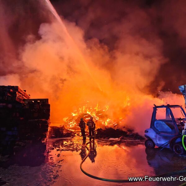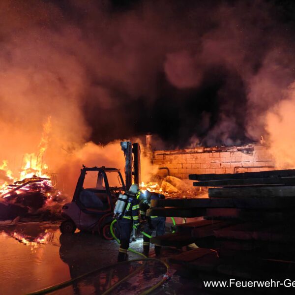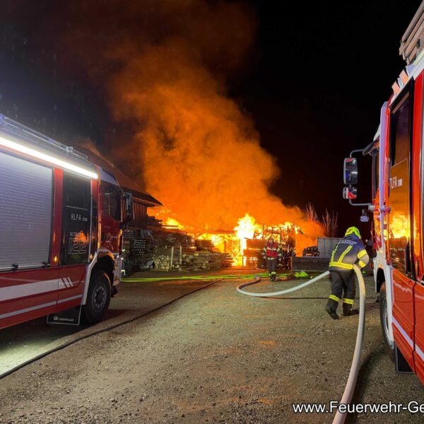 Beim Eintreffen der ersten Einsatzkräfte stand eine etwa 2.000 m² große Lagerhalle eines Altholzhändlers bereits in Vollbrand. Aufgrund der enormen Brandlast durch das gelagerte Holz und die starke Hitzeentwicklung wurde umgehend Alarmstufe 3 ausgelöst. Insgesamt standen 16 Feuerwehren im Einsatz.
